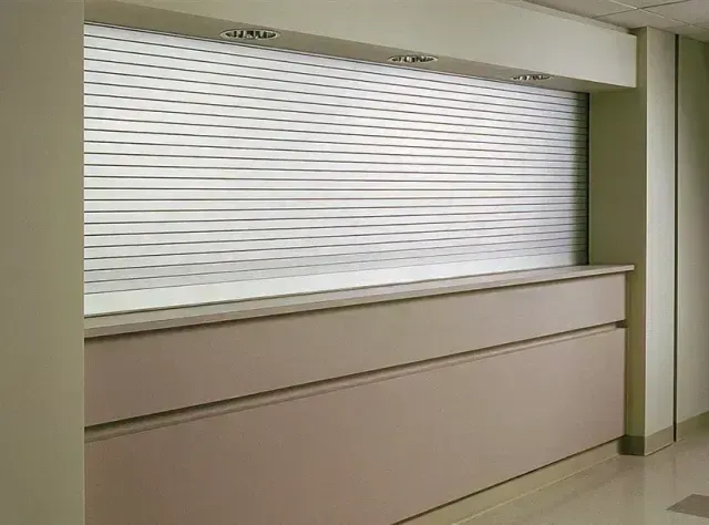 Custom rolling counter shutters close access points above counters, securing service windows and protecting similar openings.